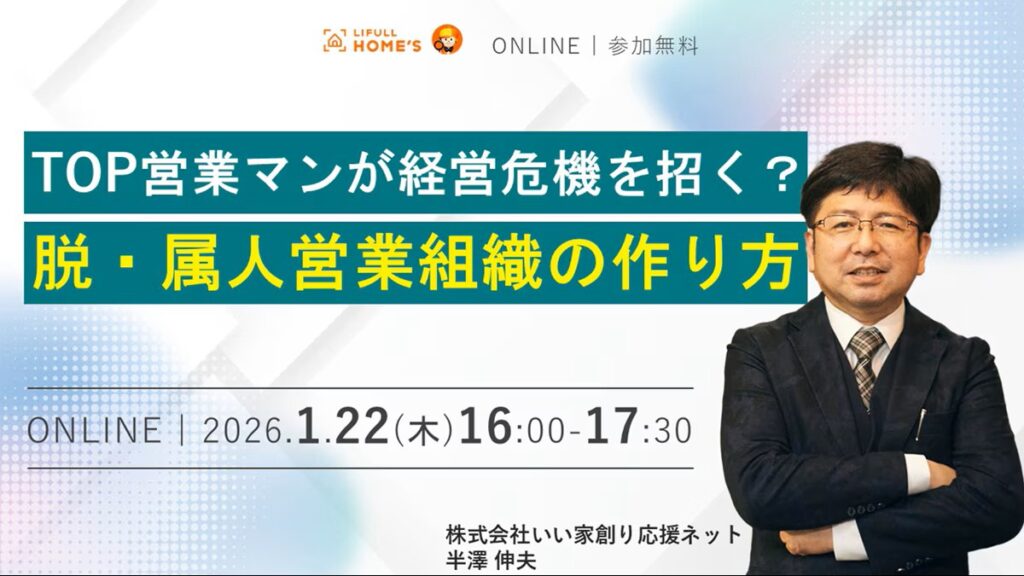 契約率の低迷、営業職の人材不足や離職、TOPセールスへの依存など、多くの工務店が共通して抱える営業面の課題の根本原因は「属人的な営業体制」にあります。 一方で、2025年に安定受注を実現している会社は、属人的営業を脱して20~30代の優秀な営業マネ... -