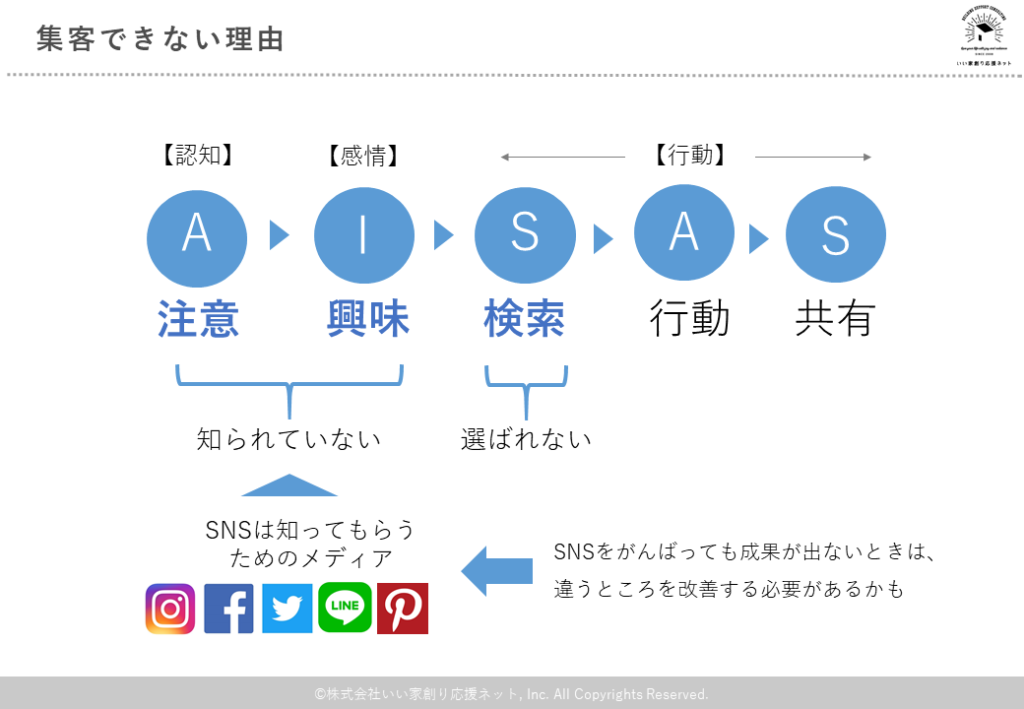 SNSに力を入れているのに集客できない工務店の大半は、この検索のステップでお客様が離脱していると考えられます。その具体的な原因として考えられるのは……