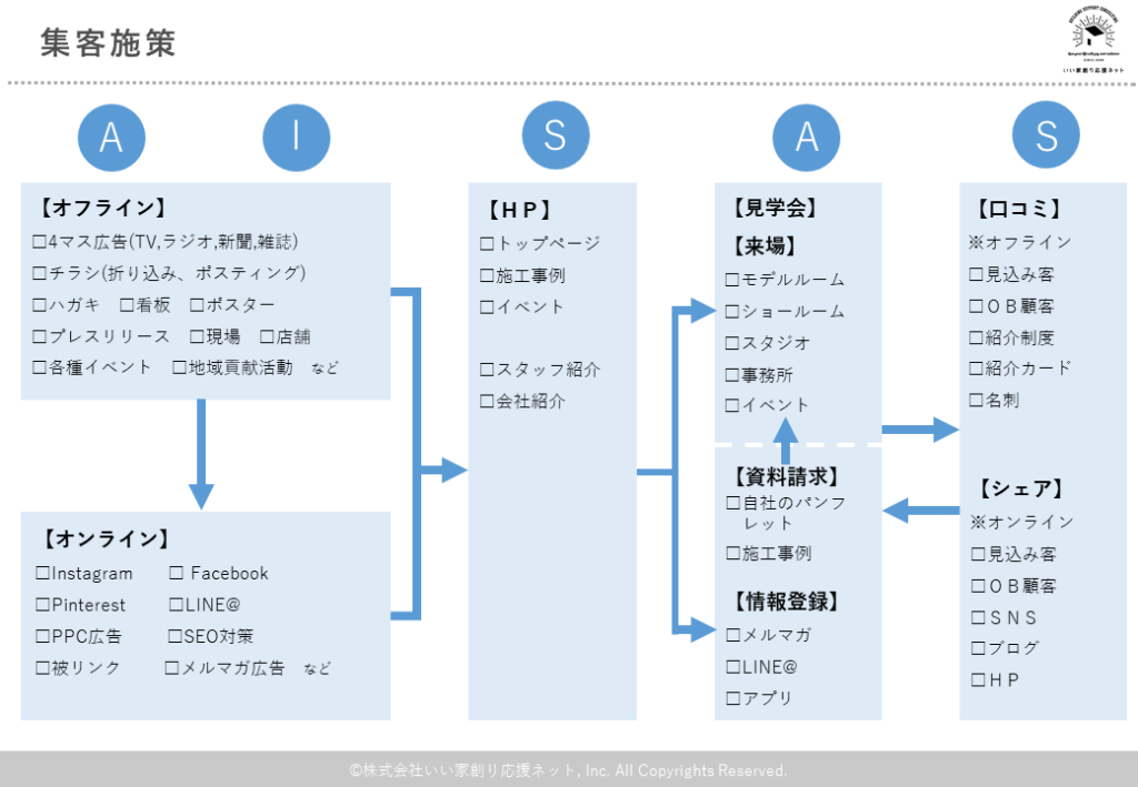 他にも集客の打ち手はたくさんあります。AISASのステップごとに基本的な集客施策とチェックポイントをまとめると下記のようになります。