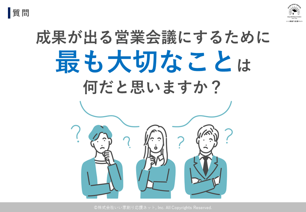 今回は営業会議に参加するすべて営業スタッフと、指示する側の営業マネージャーや責任者の双方、一緒に参加してください。なぜなら成果が出る営業会議は、誰か一人でつくるものではなく、参加者全員が協力して成り立たせるものだからです。
